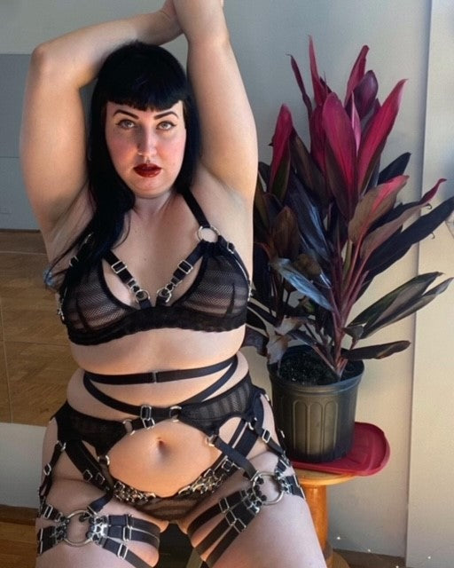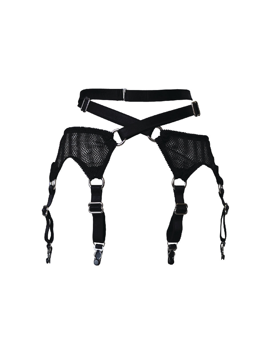 Black, mesh wrap-around garter belt. Adjustable elastic wraps around the body, closure at front with hook. Eight adjustable garters in total.